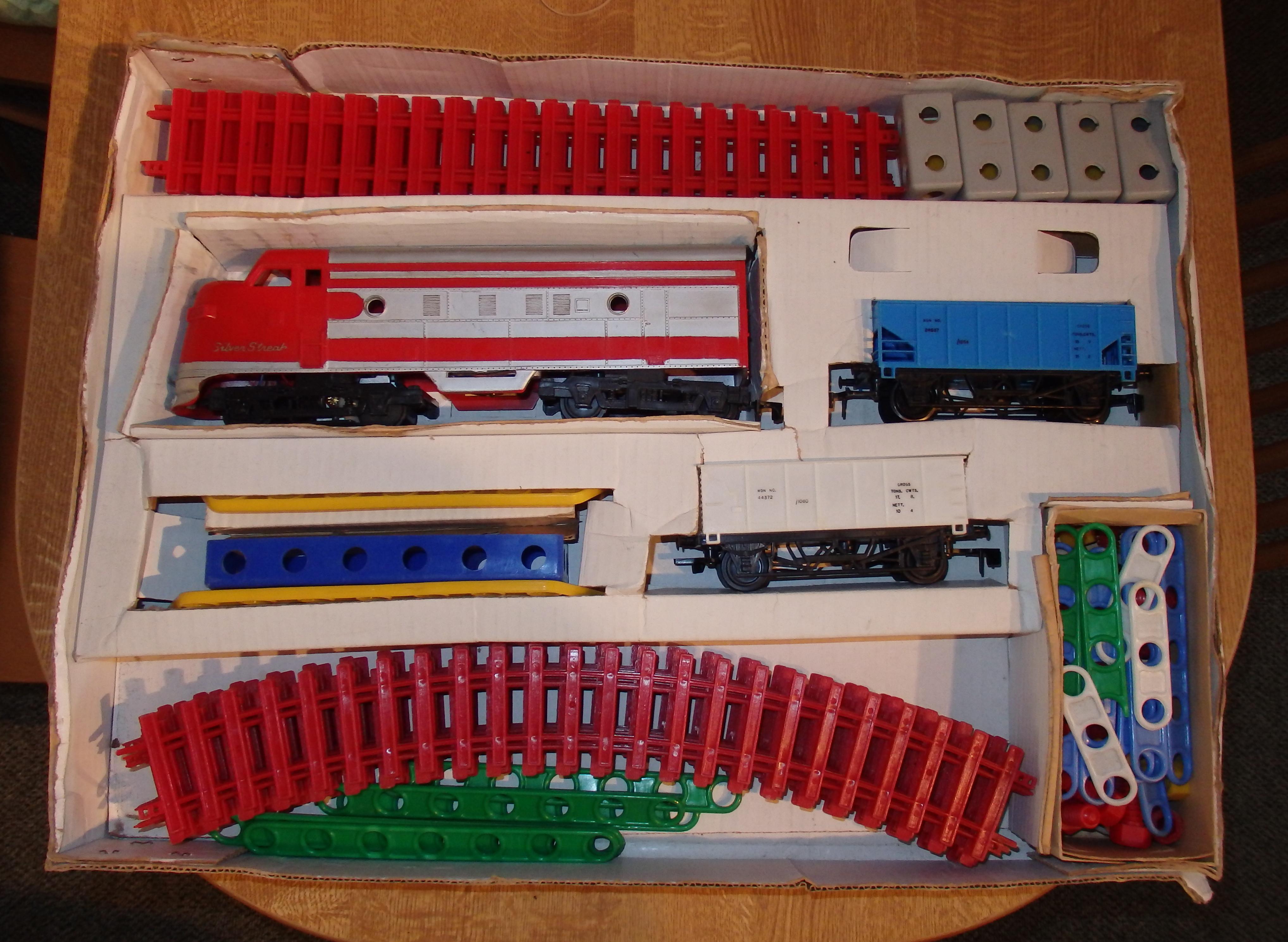 I have a fairly complete set incorporating a sort of plastic meccano and a freight train, consisting of an American-style (possibly F7) loco the hopper wagon illustrated in the original post here, and a 4-wheel gondola. All made in Hong Kong. The loco running gear is undoubtedly copied from Big Big, possibly via Red Rocket. The loco in this set has some small bits missing but runs well.